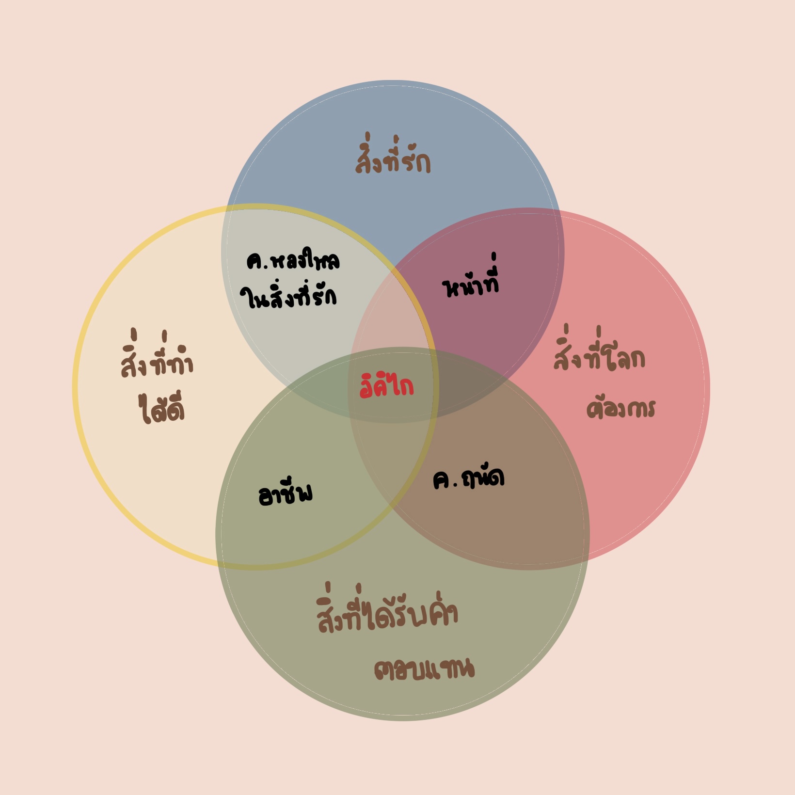 สิ่งที่สำคัญคือเราควรอนุญาตให้ตัวเองได้คิดอย่างลึกซึ้งเกี่ยวกับสิ่งที่เราชอบ โดยไม่ต้องกังวลว่าเราจะทำได้ดีหรือไม่ โลกต้องการสิ่งนั้นหรือไม่ หรือเราจะได้รับค่าตอบแทนจากการทำสิ่งนั้นหรือไม่ ก็ให้เขียนลงไปในวงกลมนี้