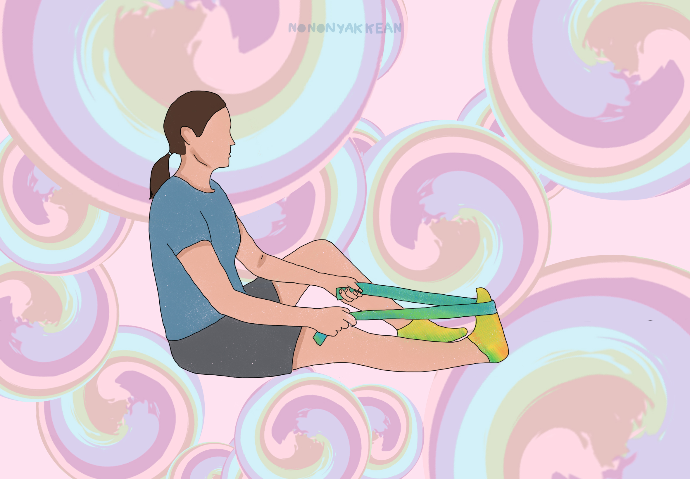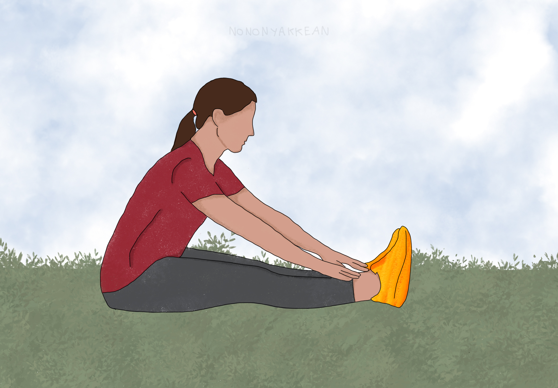 - ยืดกล้ามเนื้อโดยการเหยียดขาและค่อย ๆ จับนิ้วเท้าแล้วดึงเข้าหาตัว