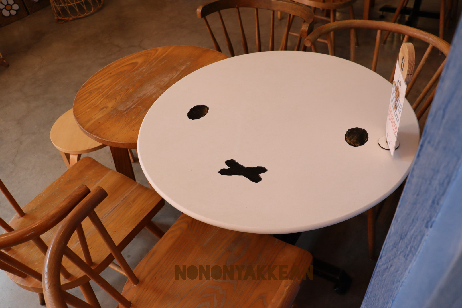 หรือหากไม่อยากนั่งกับพื้นบนพรม (ข้อเข่าไม่ดี!) ก็นั่งบนเก้าอี้ได้ โต๊ะเป็นรูปหน้าน้องมิฟฟี่ด้วยล่ะ